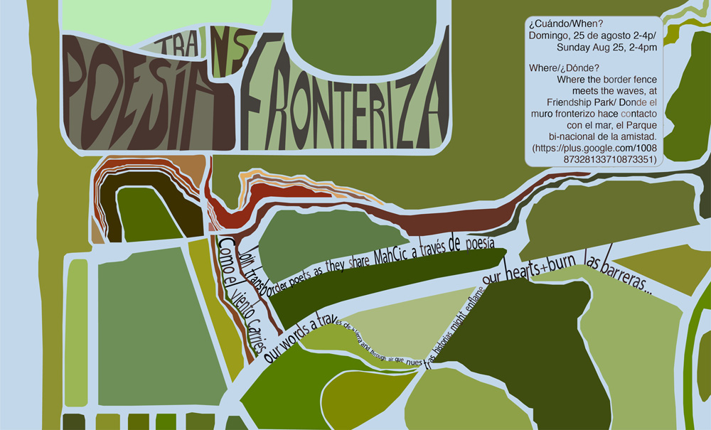 Collaborating with Liz Arizona/Bartz (who redacted text featured on the image), the volante was developed using Adobe CS5 (Photoshop + Illustrator), referring to topographical imagery of the site where the event would take place. Colors for the image were sourced from photographs of the jardín binacional de plantas nativas.